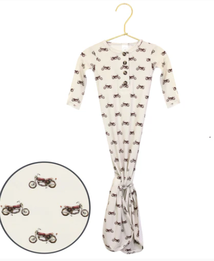 The easiest tie-bottom outfit for day or night. Made for hassle free diaper changes and gentle dressing, I designed this with a button-down front and tie bottom for simple closure (no more snaps at 2am!). Fold over wrist cuffs are the most thoughtful finishing touch.