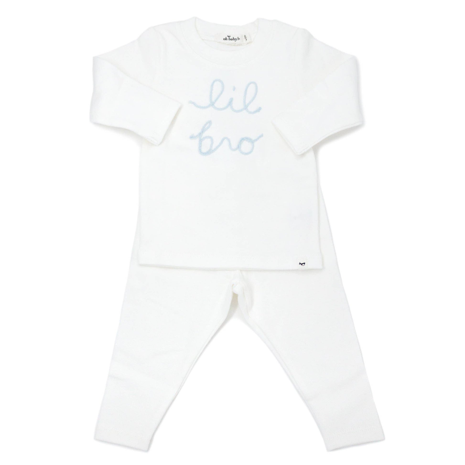 Our cream two-piece set features the word "lil bro" embroidered on the front of our super soft cotton tee. Matching cream pants with elastic waist. This outfit is the perfect take home outfit or first picture photo shoot.