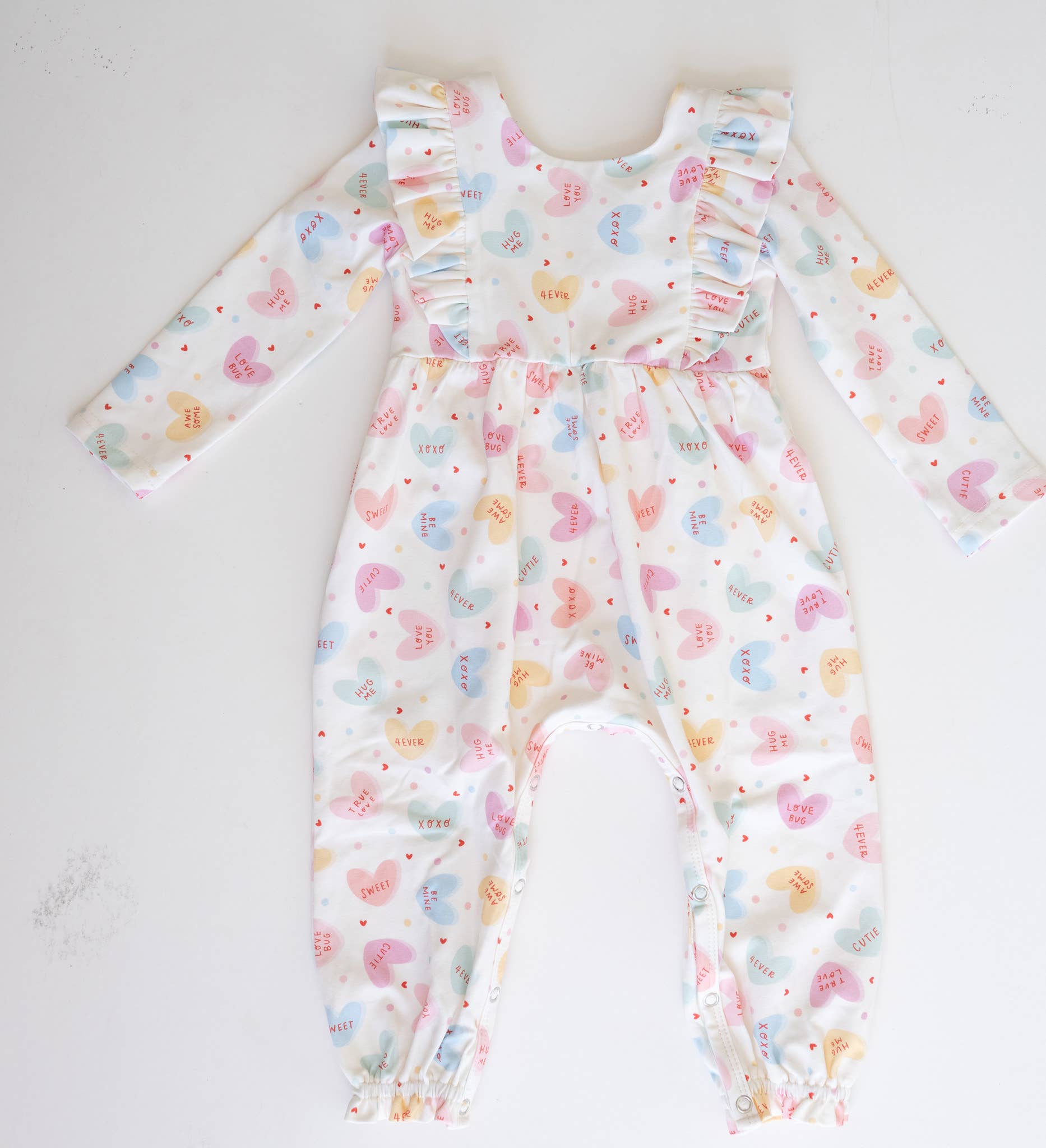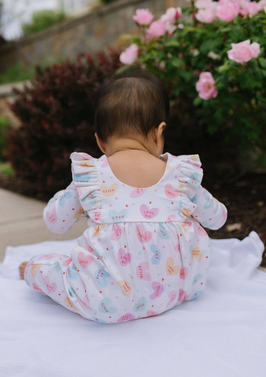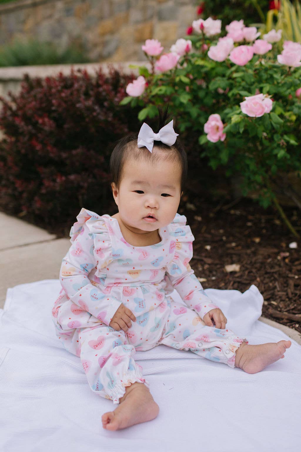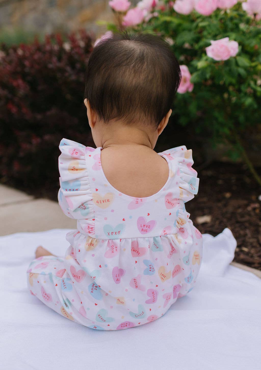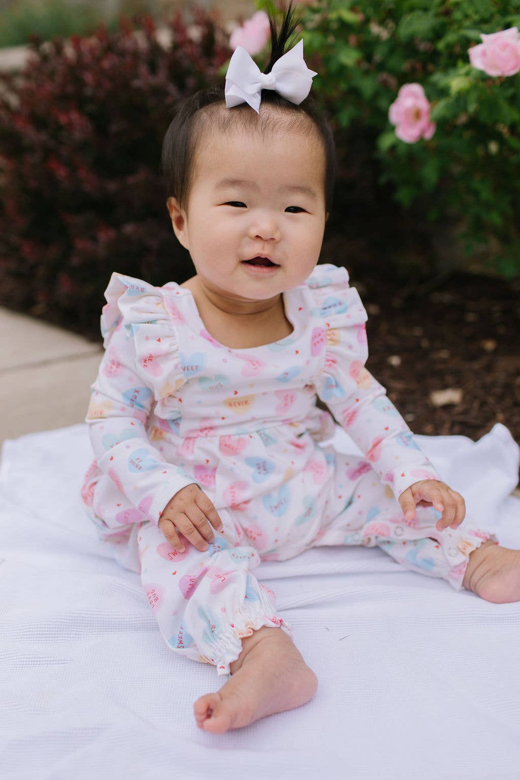 Our Mabel Bubble baby romper is crafted from our signature extra soft and stretchy fabric, designed to keep your little one comfy and cute all day long. Featuring an adorable ruffle that runs over the shoulders and highlights the charming scoop back detail, this romper pairs a snug bodysuit with cozy pants. Practical snap closures around the inseam make diaper changes quick and easy, while elastic ankle bands ensure a perfect fit.