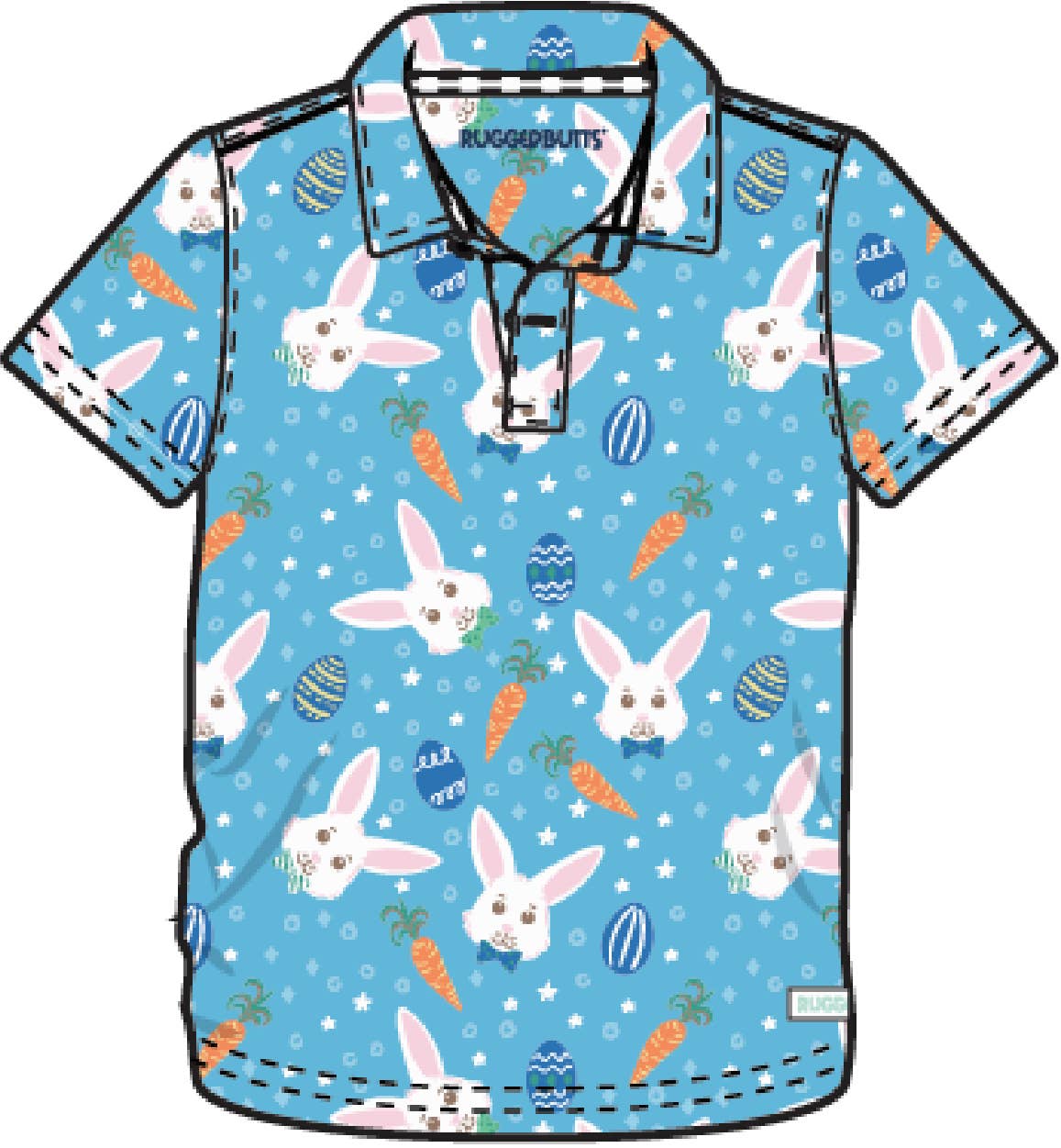 RuffleButts + RuggedButts - Boys Blue Bow Tie Bunnies Knit Short Sleeve Performance Polo