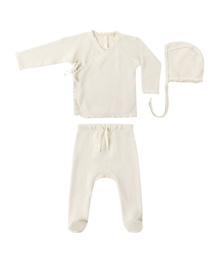 Our Take Home Set in soft, lightweight waffle fabric is the perfect outfit for welcoming your newborn. This sweet set includes a bonnet, a wrap snap and tie top, and footed drawstring pants.